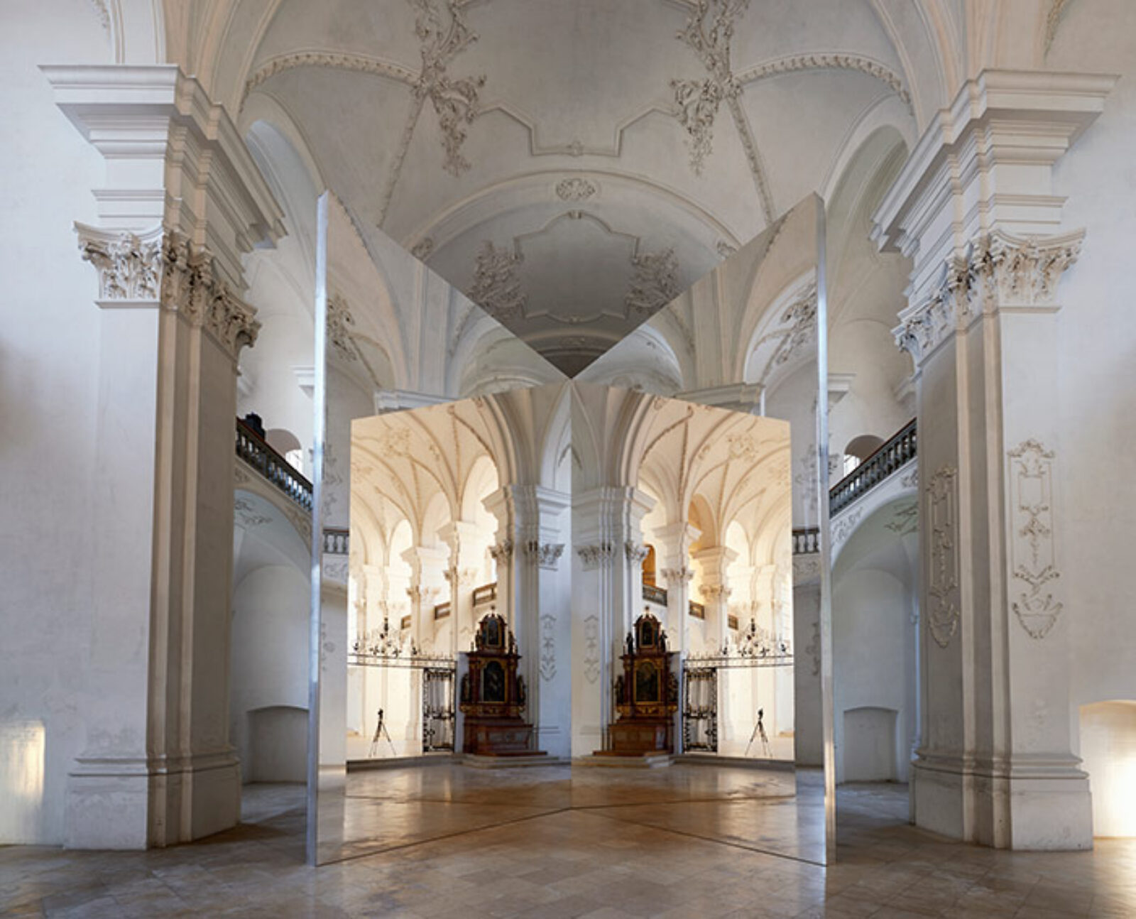 Les arêtes tranchantes d’un objet noir et monumental contrastent avec les formes galbées des stucs et de la voûte. L’espace inondé de lumière et le blanc dominant sont littéralement absorbés par cet objet. L’installation, qui au premier regard apparaît comme bidimensionnelle, nous renvoie à nous-même: nous nous trouvons devant une énigme visuelle, dont la réponse se trouve en nous, ou peut-être au dos du monolithe. La curiosité nous pousse à explorer ce lieu devenu inconnu, en nous frayant un chemin vers de nouvelles prises de conscience de l’espace, et de nous-même. De l’autre côté l’installation est couverte de miroirs. Le spectateur pénètre dans une pièce virtuelle, résultat de l’intrication de l’espace réel et de ses reflets. Il y rencontre son reflet, quadruplé.
